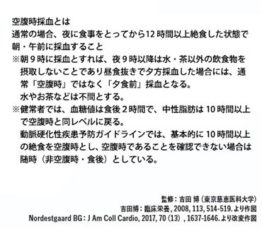 本来、血清の濃度や活性のレベルは、生体内の恒常性維持に基づき一定の範囲内で安定しています。各測定値の日内変動に留意したデータ解釈が大切です。その日内変動のなかで、睡眠、食事、身体活動などが測定値に影響を及ぼすことがあります。なかでも例えば、食後に値が上昇する代表例がトリグリセライド(TG)値や血糖値ですが、カットオフレベルを超える食後高脂血症(食後高 TG 血症)や食後高血糖などは、動脈硬化性疾患の危険因子としても重要な意味を持ちますので、関連するガイドラインを参考に対応する必要があります。