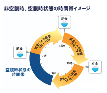 TGが分解されて生成される遊離脂肪酸(NEFA)は、食後に値が低下します。脂肪組織に蓄えられているTGは、空腹時に分解されてエネルギー源として使われますが、食事により吸収された糖質などがエネルギー源に利用されるので、脂肪組織のTGの分解が不要になります。したがって、NEFAは空腹時で濃度が高く、食事をとると低下します。また、この食事摂取エネルギーのバランスから空腹時ではケトン体が増えますが、食事によりケトン体が減ります。その他として、一般的にはインスリンの作用などにより、血中の無機リンは細胞内に移行するので、無機リン値は食後に低下します。一方、無機リンは有機リンと比べて小腸で吸収されやすいので、腎不全の患者さんの場合では、無機リンを多く含む加工食品・インスタント食品などの食後は無機リンの測定値は要注意です。また血清亜鉛値は午前中に高く、午後にかけて低くなりますが、これにも食事の影響があります。血清亜鉛値は空腹時に上昇し、食後2、3時間後に20%ほど低下します。