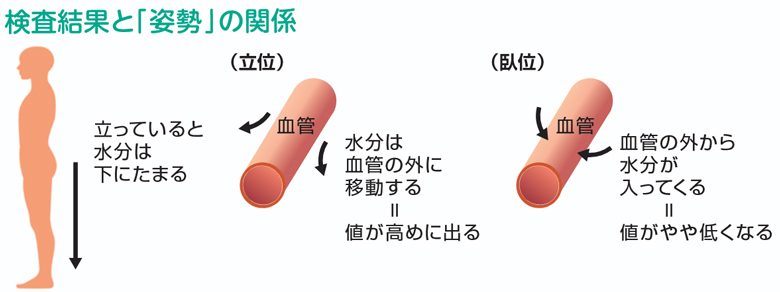 例えば、貧血の指標の1つである、 赤血球数やヘモグロビンは、立っているとき(立位)、座っているとき(座位)、横になっているとき(臥位)で値が変化することがあります。通常は座位で採血しますが、立位では重力の影響で足のほうに水分が多くたまります。そして、一部の水分が血管の外に移動し、血液が濃くなって値が高めに出ることがあります。臥位では、逆に血管内の水分が増えて薄まり、座位より値がやや低くなる傾向があります。アルブミンや総蛋白も、立っていると血液が濃縮されて濃度が高く出やすく、臥位では低く出ることがあります。