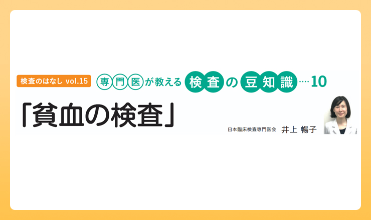 貧血の検査では、まず、赤血球数(RBC)、ヘモグロビン濃度(Hb)、血液中の赤血球が占める割合であるヘマトクリット値(Ht)を調べるのが基本です。ヘモグロビンの値をチェックして、基準値(おおよそ成人男性13g/dL、成人女性12g/dL)未満の場合は貧血が疑われます。また、検査の表をよく見ると、MCV(平均赤血球容積)や、MCHC(平均赤血球ヘモグロビン濃度)という項目もありますが、これらより貧血の原因を推測することができます。