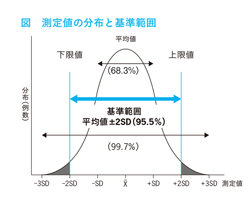 「基準範囲」は基準個体から得た基準値を用いて、統計的に求めた基準分布の中心部95%の基準値が含まれる範囲です(図)。